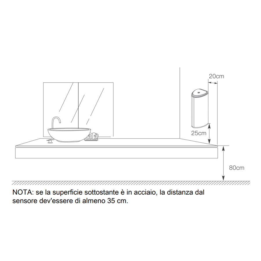 Il distributore automatico di sapone o igienizzante liquido modello Toronto, realizzato in acciaio inossidabile, eleva l’igiene quotidiana con una presenza sobria e raffinata. Grazie al sensore infrarossi, l’erogazione avviene in modo silenzioso e senza contatto, offrendo una pulizia immediata e discreta. Progettato per montaggio a parete, ottimizza lo spazio senza compromettere l’estetica, ideale in contesti sia residenziali che professionali. Il serbatoio da 650 ml assicura cicli prolungati tra rifornimenti, mentre l’erogazione singola regolabile permette di modulare la quantità di prodotto in base alle necessità.