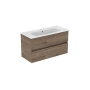 Mobile sospeso con lavabo in ceramica da 64x46 con con doppio cassetto a chiusura rallentata finitura noce americano scuro Ideal Standard Smart