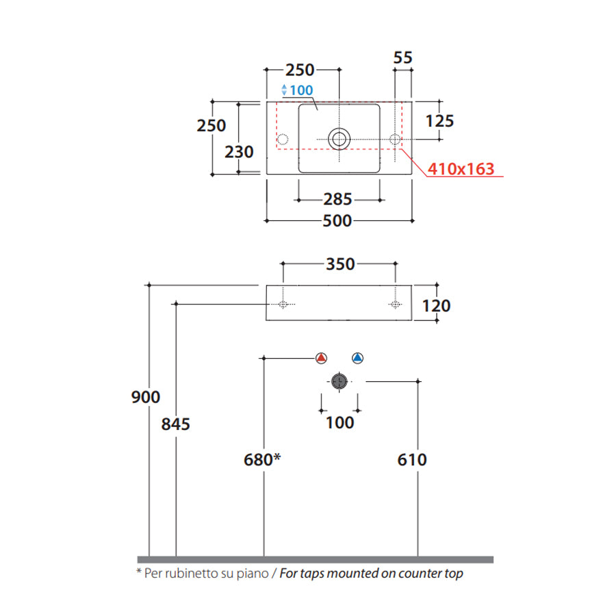 Lavabo 50x25x12h cm. Installazione sospesa o da appoggio. Completo di fissaggi. In ceramica bianca
