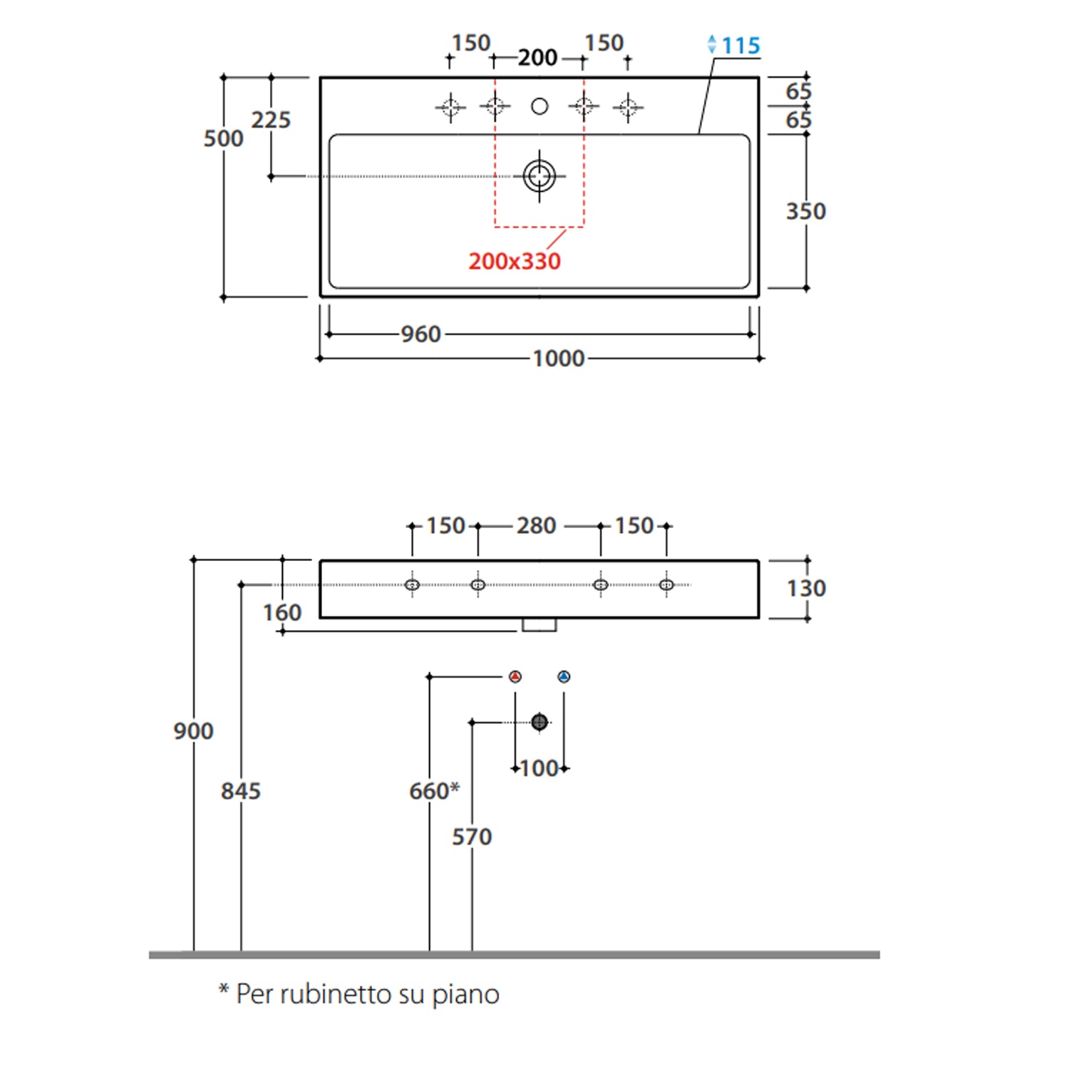 Lavabo rettangolare Stone 100x50x13 cm Ceramica Globo Bianco lucido