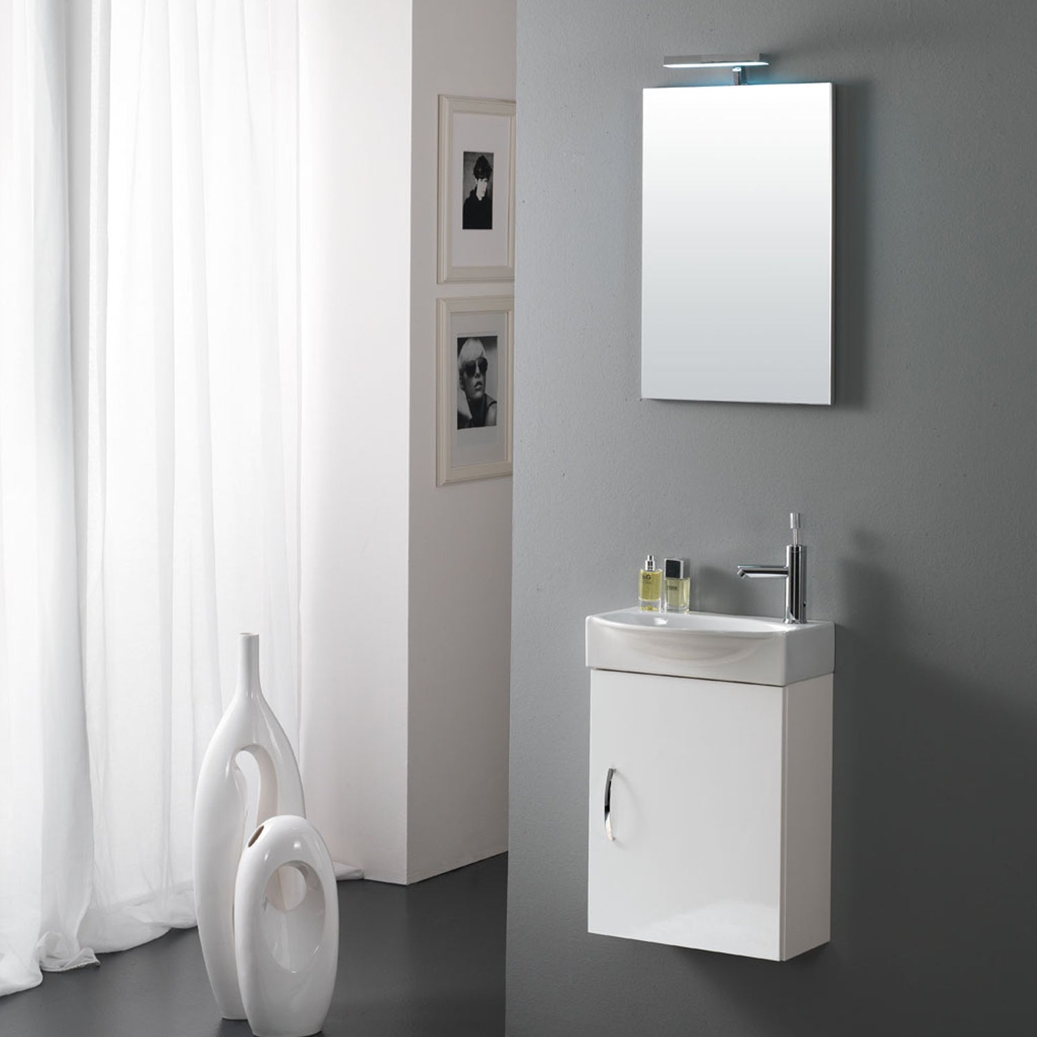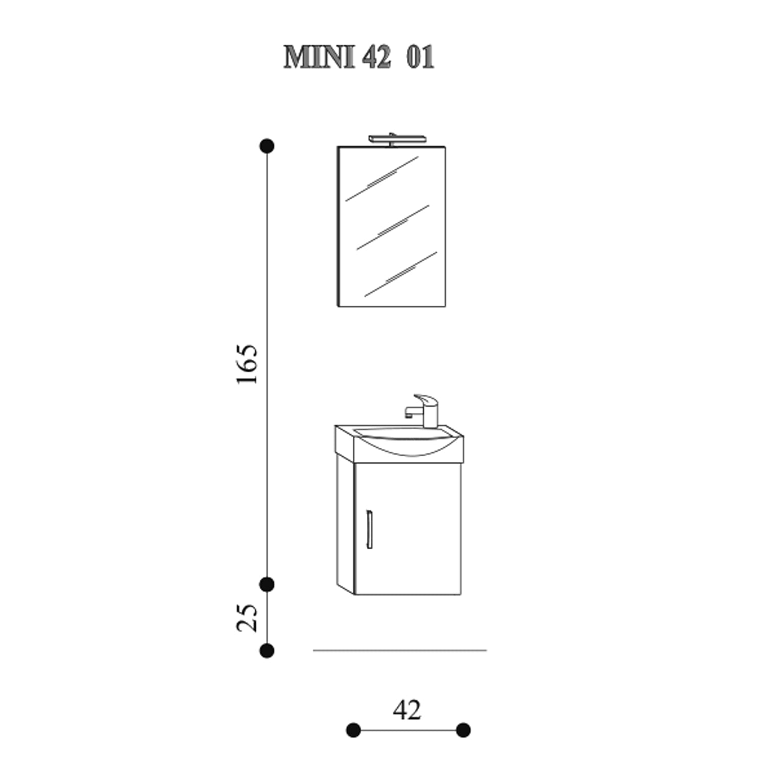Mobile bagno sospeso Mini42, laccato lucido bianco, con base portalavabo a 1 anta. Design lineare e compatto che si integra facilmente in bagni di piccole dimensioni, offrendo una superficie lavabo elegante e un contenimento ordinato. La finitura lucida assicura brillantezza duratura e facilità di pulizia. Mini42 vista frontale