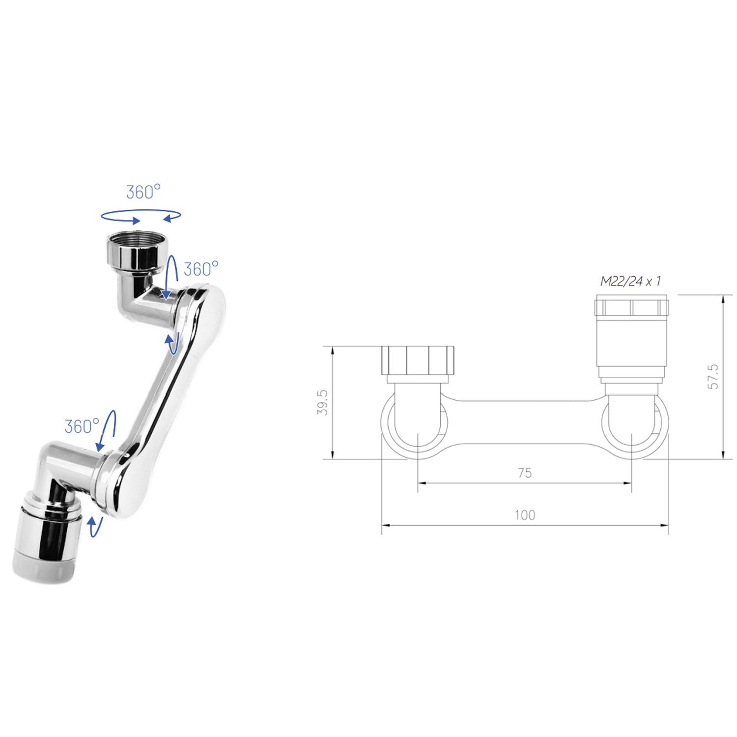 Pensata per durare nel tempo, presenta un design orientabile che offre versatilità senza compromettere l'estetica. L'attacco universale M22/M24 assicura compatibilità con una vasta gamma di rubinetti, mentre la finitura cromata riflette una lucentezza pulita e sofisticata. Questo accessorio—sobrio, ma presente—porta un valore continuo a cucina e bagno, diventando un elemento di design affidabile per chi cerca qualità senza tempo.