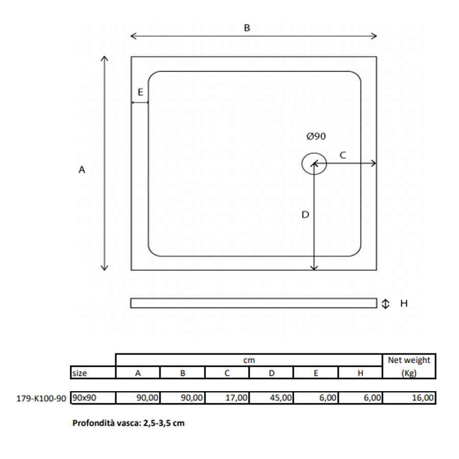 • Dimensioni e forma: 90x90 cm, altezza 6 cm, piatto doccia quadrato.