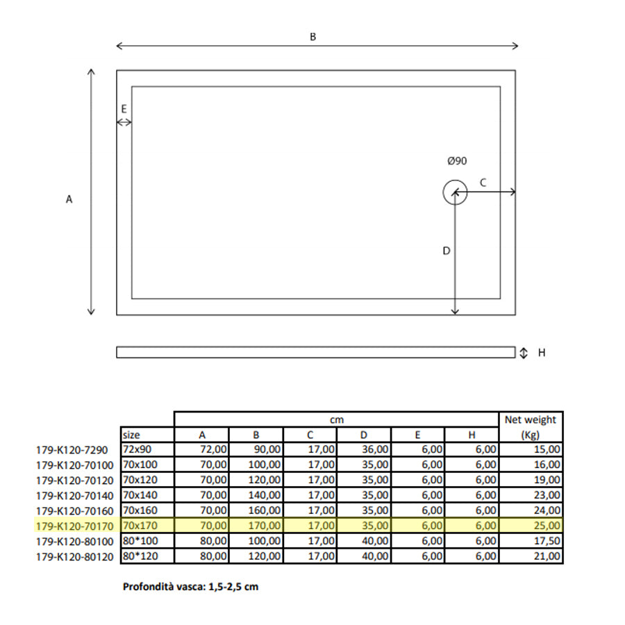 Il piatto doccia rettangolare Kepler, 70x170 cm, alto 6 cm, in acrilico rinforzato, è espressione di una raffinatezza sobria per bagni moderni. Le geometrie pulite, gli angoli interni squadrati e una superficie bianca impeccabile combinano resistenza e stile in una soluzione di design senza tempo. Senza piletta, è predisposto per l'allacciamento al sistema di scarico scelto, offrendo installazione pulita e flessibile.