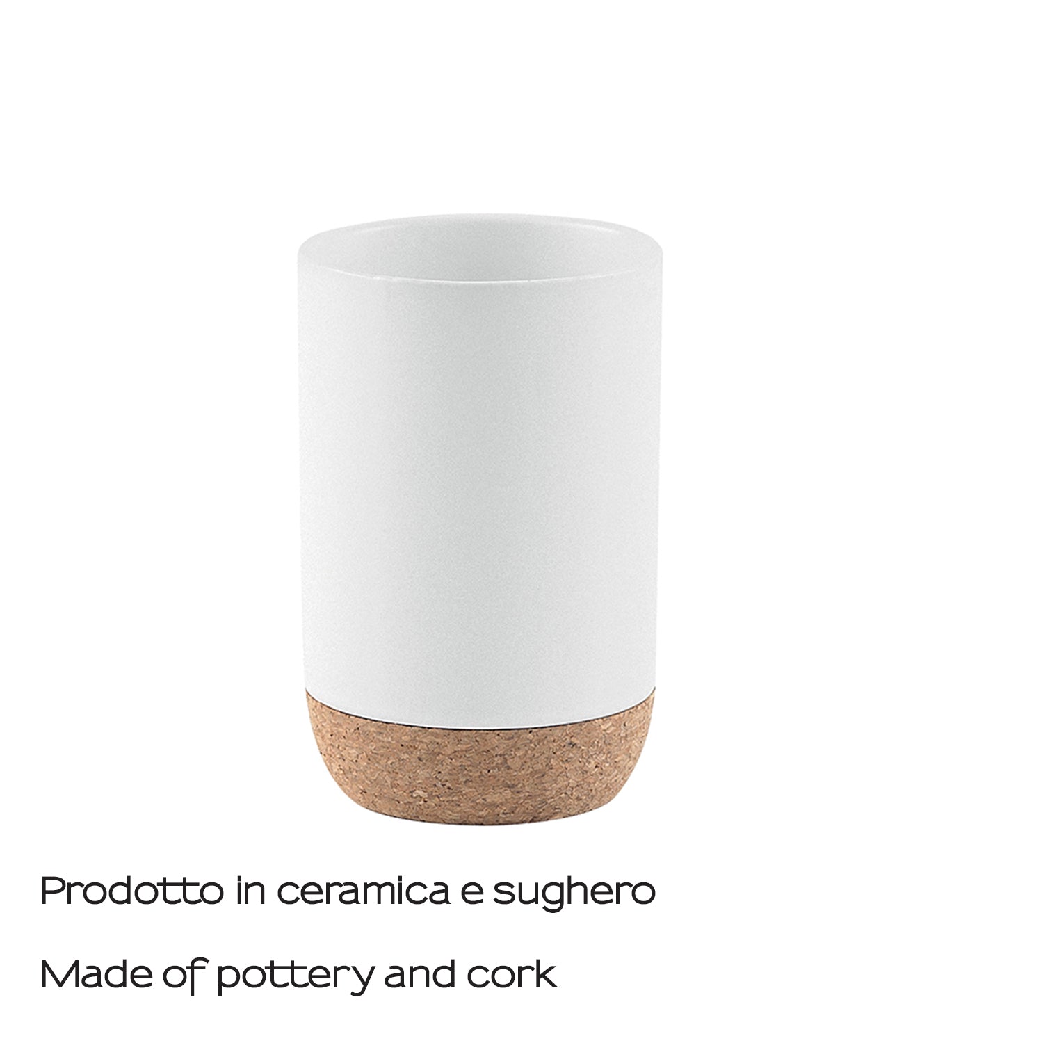 - Materiali: ceramica smaltata bianca e base in sughero naturale.