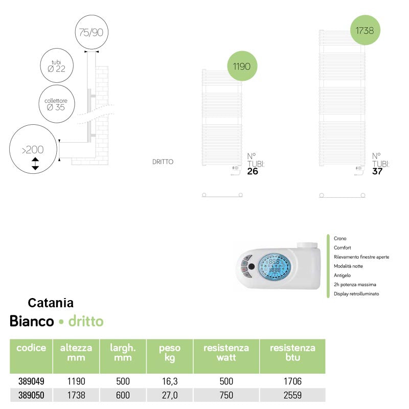 Termoarredo elettrico bianco Lazzarini E-Catania si presenta come un elemento di design per bagni contemporanei: affidabile, immediato e privo di impianto idraulico. Realizzato in acciaio al carbonio verniciato, offre linee pulite e una robusta presenza estetica. Con 26 tubi orizzontali e una resistenza di 500 watt, garantisce un riscaldamento rapido e uniforme. Progettato per l’installazione a parete, arriva completo di termostato e fissaggi, offrendo praticità immediata e controllo della temperatura. È un prodotto Made in Italy, espressione di artigianato e qualità riconosciuta nel tempo.