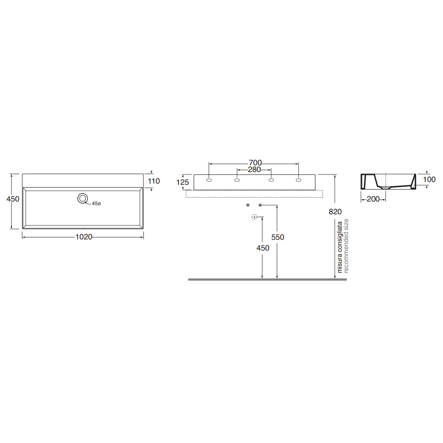 Aufsatz-/hängendes quadratisches Waschbecken Ceramica Azzurra Elegance 102x45 cm ohne Armaturenloch