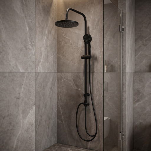 Eine Duschsäule ist ein komplettes System, das eine vertikale Stange mit dem Mischer verbindet, an der ein oberer Duschkopf und eine Handbrause montiert sind. Diese Konfiguration ermöglicht die Wahl zwischen verschiedenen Wasserstrahlarten und verbessert Komfort und Vielseitigkeit.