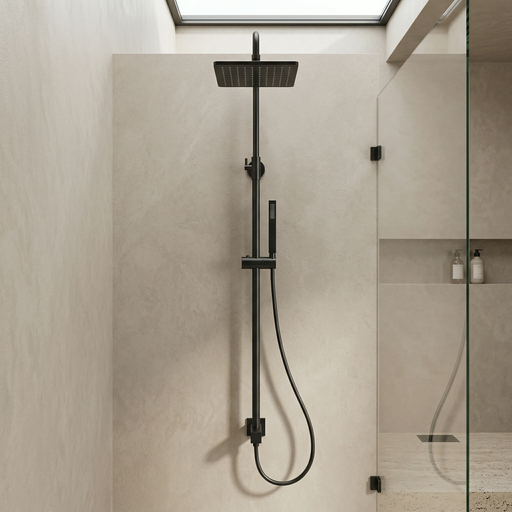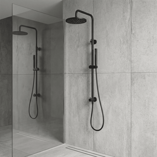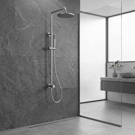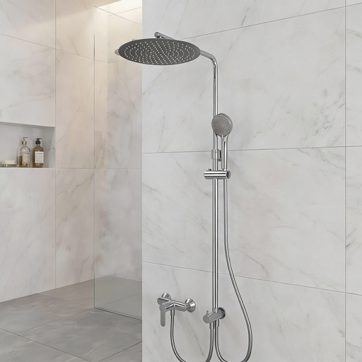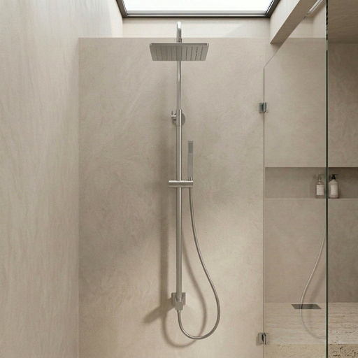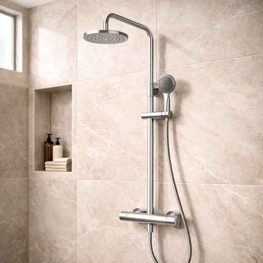 Eine Duschsäule ist ein komplettes System, das eine vertikale Stange mit dem Mischer verbindet, an der ein oberer Duschkopf und eine Handbrause montiert sind. Diese Konfiguration ermöglicht die Wahl zwischen verschiedenen Wasserstrahlarten und verbessert Komfort und Vielseitigkeit.