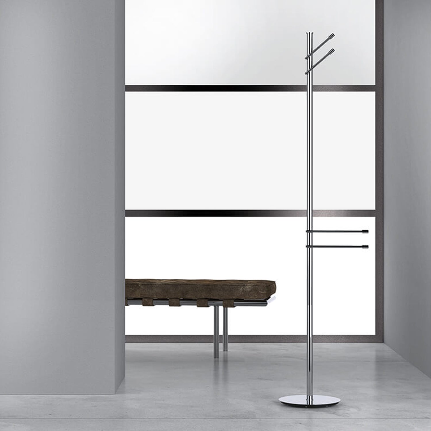 Mit einem dezenten Glanz veredelt, erhebt sich diese Stehleuchte aus verchromtem Messing mit eleganter Zurückhaltung. Sie gehört zur Kollektion Isole di Colombo Design, Verkörperung von Funktionalität, Stil und Vielseitigkeit. Die schlanke Säule, die glänzende runde Basis und die fein ausgearbeiteten Details zeugen von sorgfältiger Handwerkskunst: ein Gleichgewicht zwischen Form und täglichem Gebrauch, das der Zeit standhält. Die zwei Handtuchhalter und zwei Haken, auf unterschiedlichen Höhen angeordnet, bieten Praktikabilität, ohne die visuelle Harmonie zu beeinträchtigen.