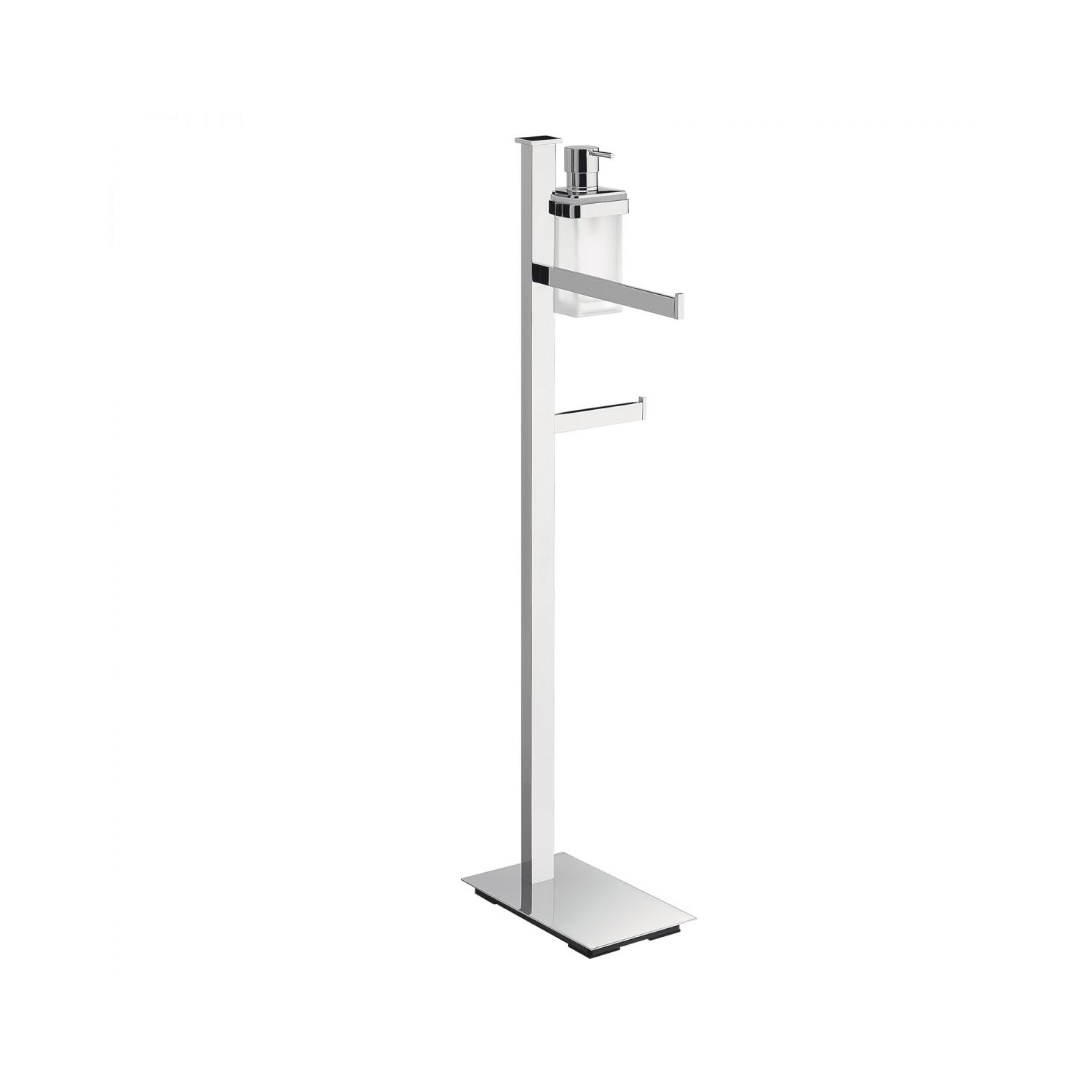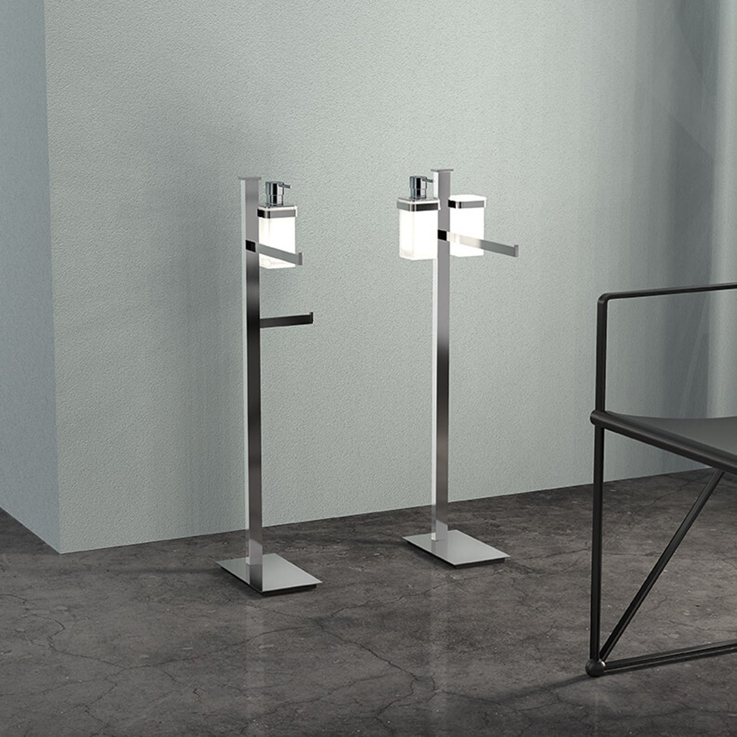 Rechte Stehleuchte mit Seifenspender, Rollenhalter und Handtuchhalter aus Messing Units von Colombo Design stellt eine Synthese aus Funktion und raffinierter Schlichtheit dar. Die Säule, gefertigt aus poliertem Messing, verfeinert die Badezimmerecke mit eckigen Linien und reflektierenden Oberflächen und bietet eine zurückhaltende und prestigeträchtige Präsenz. Von einer renommierten italienischen Marke, bekannt für handwerkliche Exzellenz, erzählt diese Stehleuchte eine Geschichte von Detailpflege und Langlebigkeit, die jeden Raum ohne Prahlerei aufwertet.
