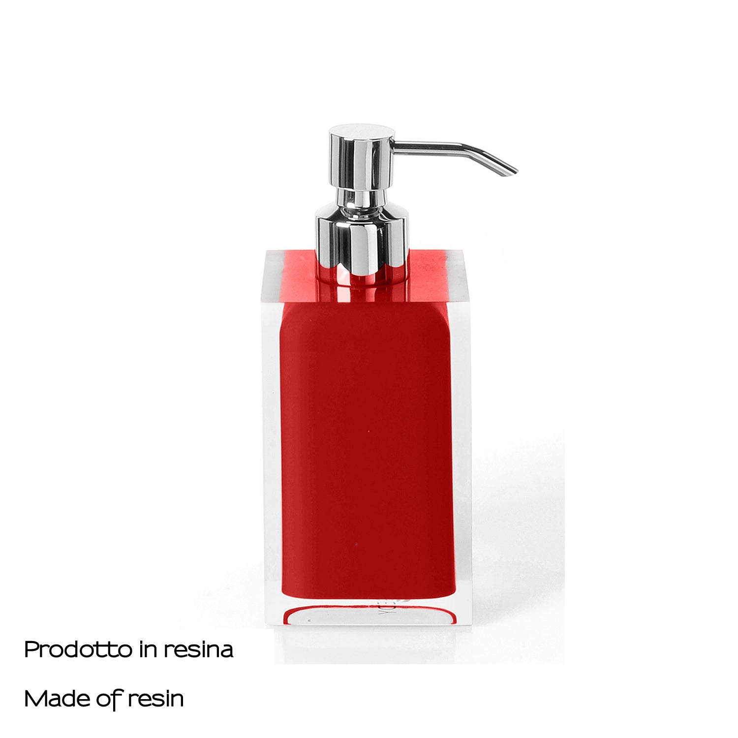 Countertop soap dispenser from Gedy's Rainbow collection, a synthesis of functionality and refined aesthetics. The body, made of bold red resin, offers a vibrant presence that enhances the bathroom without ostentation, while the chromed metal dispenser adds brightness and reliability. With a capacity of 210 ml, it is designed for practical refills and daily use, maintaining a clean and timeless line. This piece reflects artisanal care for high-quality materials and a design meant to last over time, making the environment more elegant and exclusive.