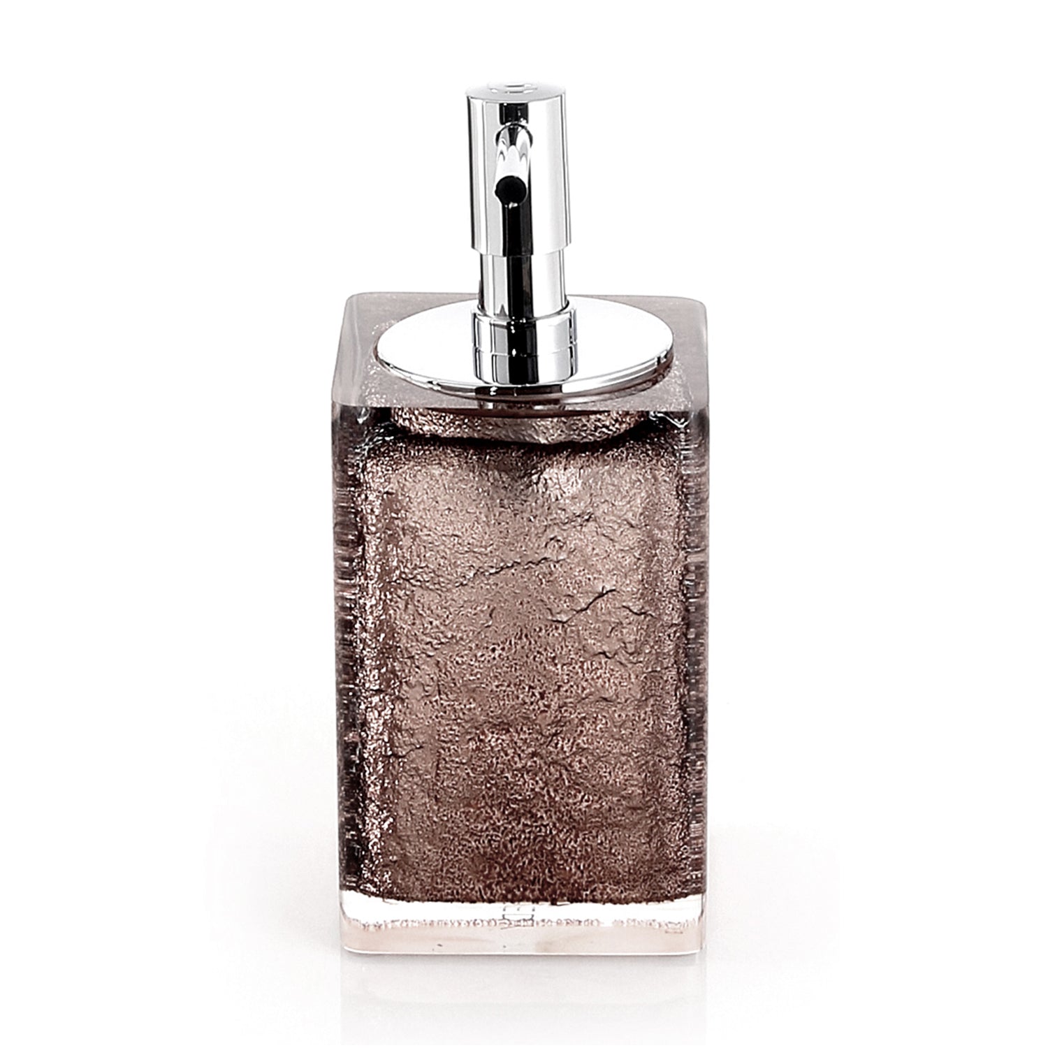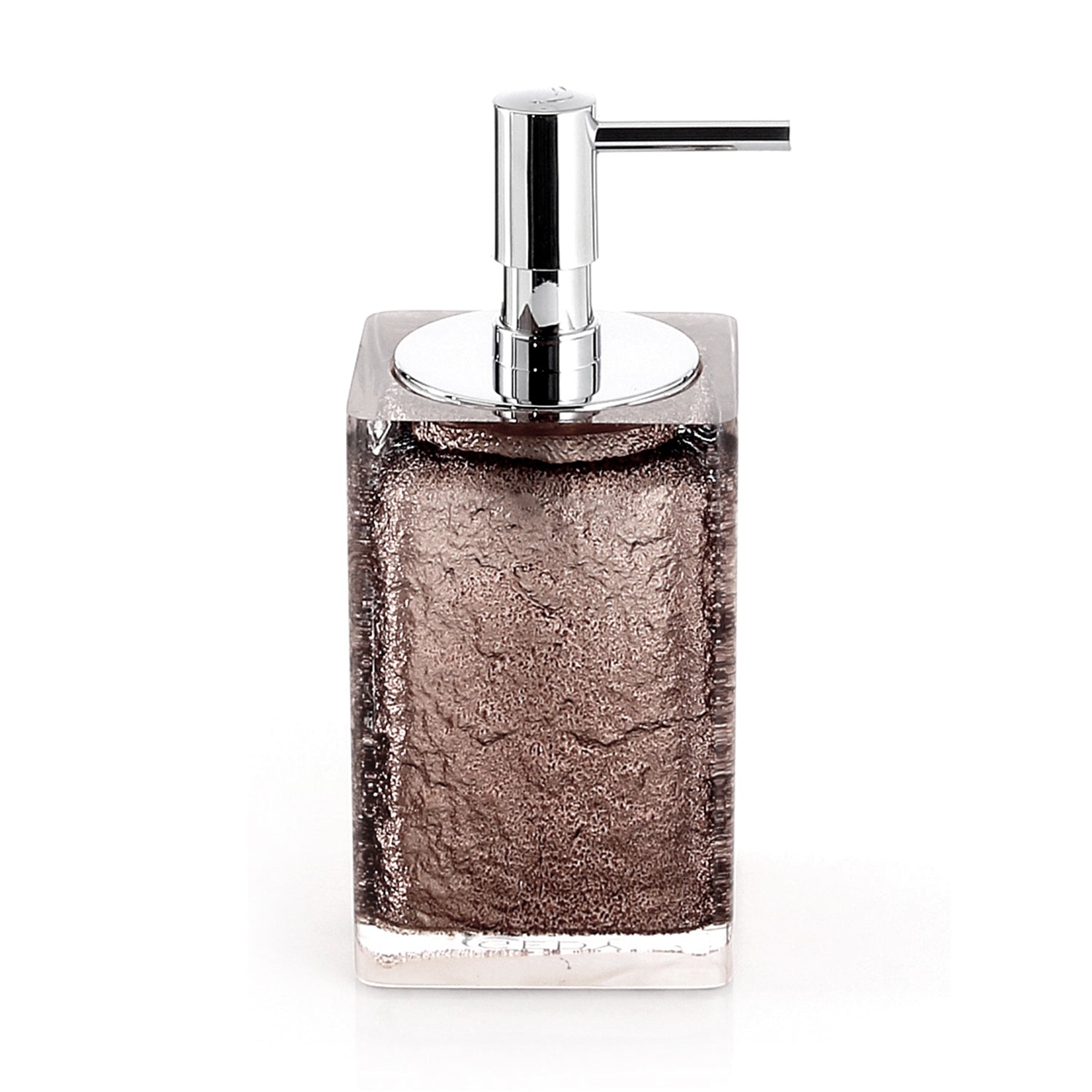 Functional elegance: the Giulia series countertop soap dispenser by Gedy combines artisanal craftsmanship and contemporary design to enrich the bathroom with discreet refinement. Made of high-quality resin, the central body features a transparent finish that reveals subtle brown veins, adding depth and warmth to the space. The line is clean and geometric, with soft edges and a stable base that ensures balance even on wet surfaces. The chromed metal pump, shiny and durable, completes the aesthetic with a touch of controlled brilliance.