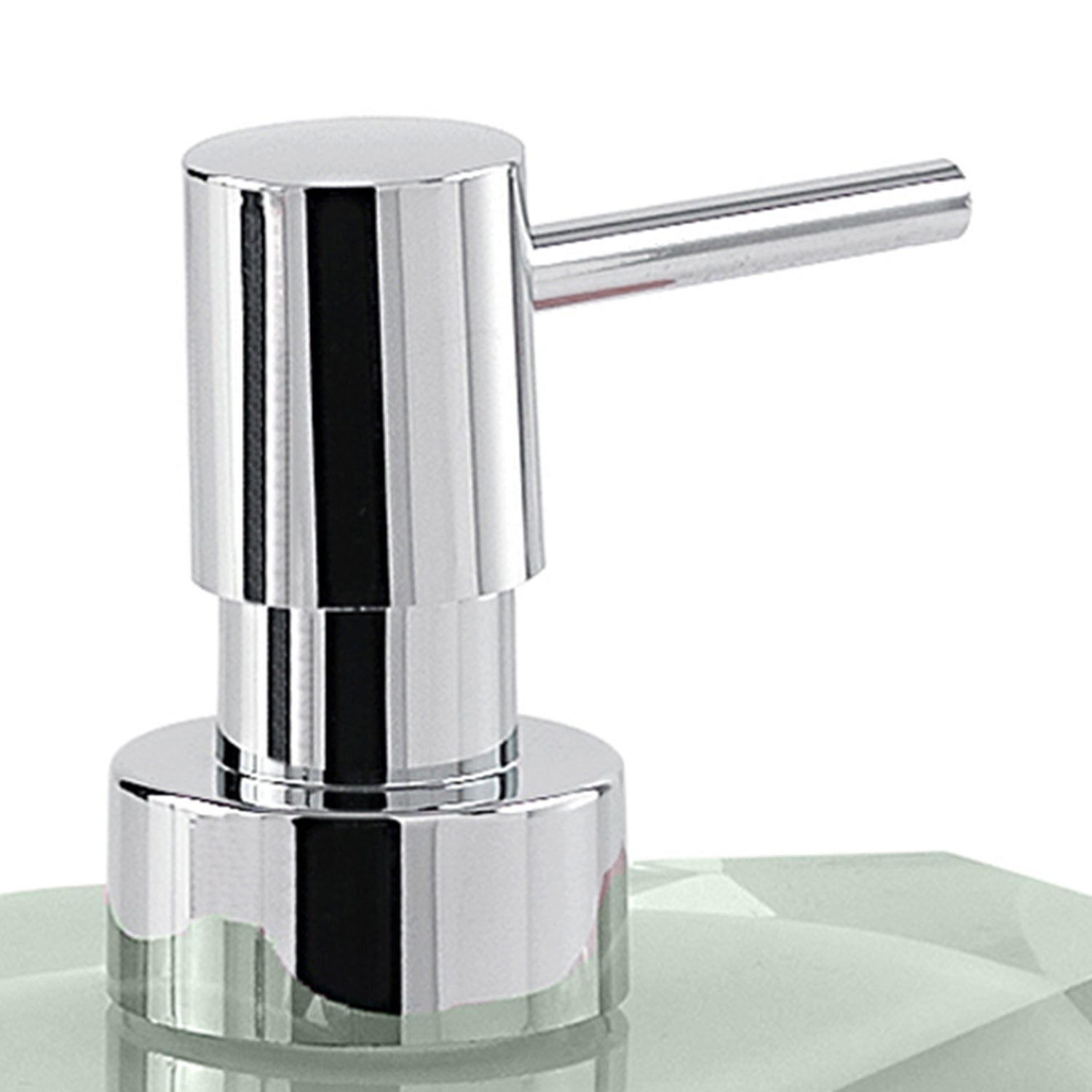 The soap dispenser from Gedy's Chanelle series, in Mint Green, elevates the bathroom with a note of rare refinement. Made of durable resin, the body features sober lines and smooth surfaces that capture the light. The chrome dispenser offers an impeccable tactile sensation, ensuring smooth performance over time. Every detail reflects artisanal care and a heritage that speaks of Italian design and lasting quality.