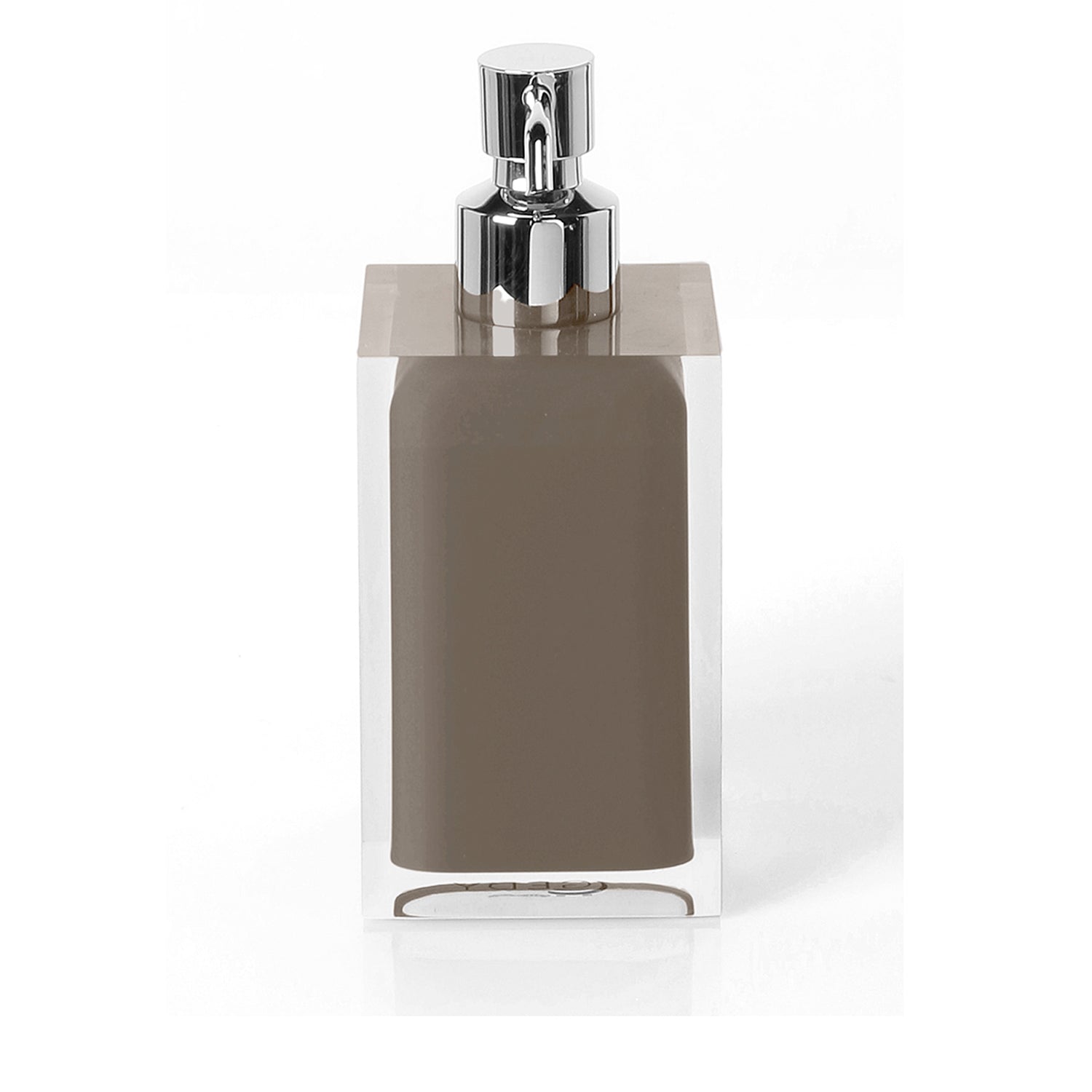 The countertop soap dispenser with chrome metal pump from Rainbow, by Gedy, is a small manifesto of daily luxury. Made of high-quality taupe resin, it combines a sober presence with clean lines and a construction that conveys solidity and refinement. The chrome metal pump expresses a touch of controlled brilliance, while the transparent structure enhances its squared shape, turning the whole into a bathroom detail that keeps up with the times. Limited availability, as each piece is designed to offer a premium presence without design flaws. 210 ml capacity, for prolonged use without sacrificing elegance.
