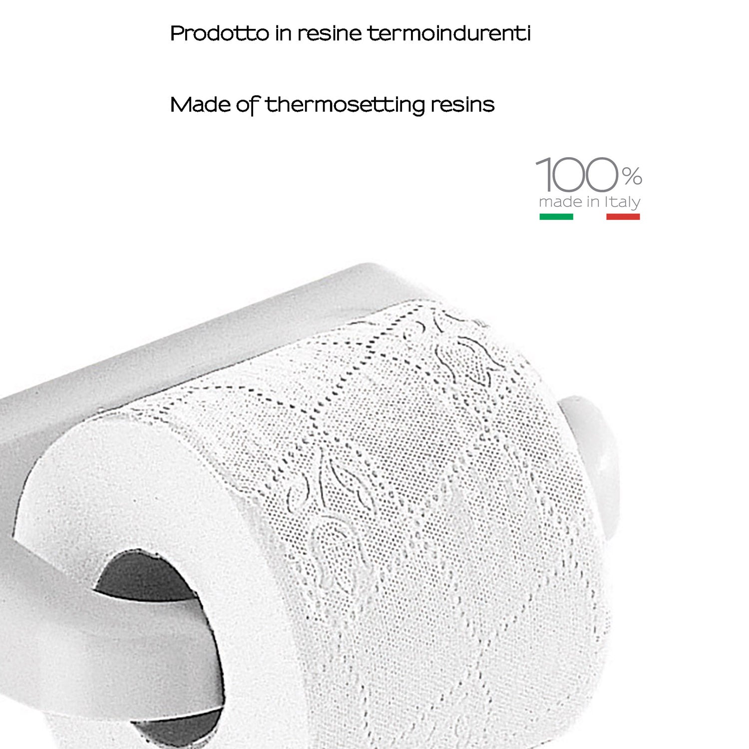 Wall-mounted toilet paper holder from the Darios series by Gedy, a piece that elevates the daily routine to a stylish gesture. Made of thermosetting resins and finished in glossy white, it is the meeting point of technical robustness and formal refinement. Made in Italy, it embodies discreet artisanal origin and durability that translates into value over time. The elegant surface, crossed by subtle patterns that catch the light, gives the bathroom a touch of timeless sophistication.