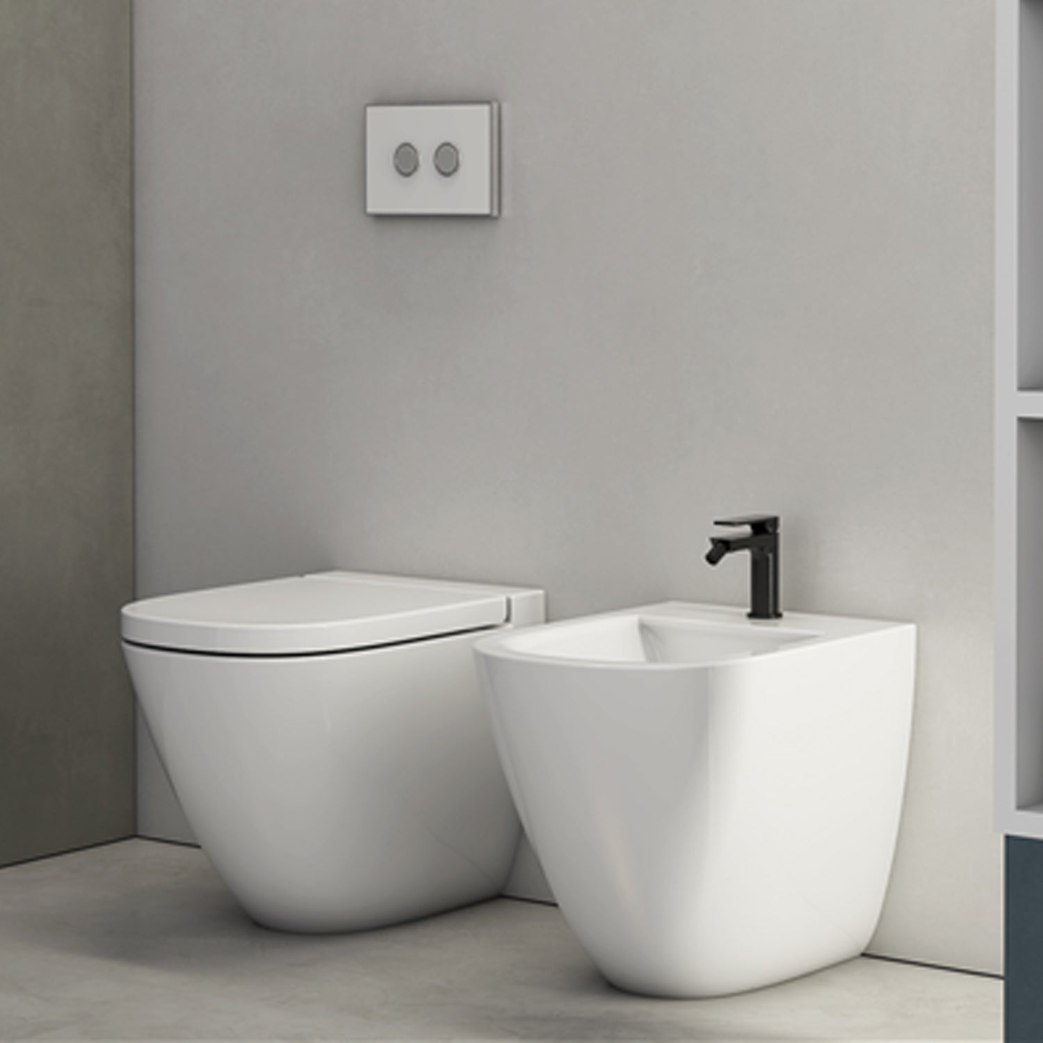 - Floor-mounted sanitary ware with wall-hugging installation.