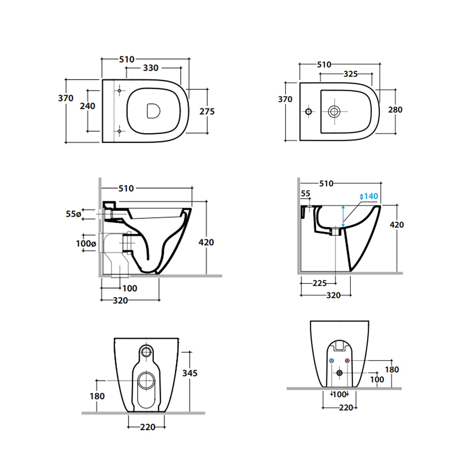 - Usable dimensions: 51x37 cm (wc and bidet).