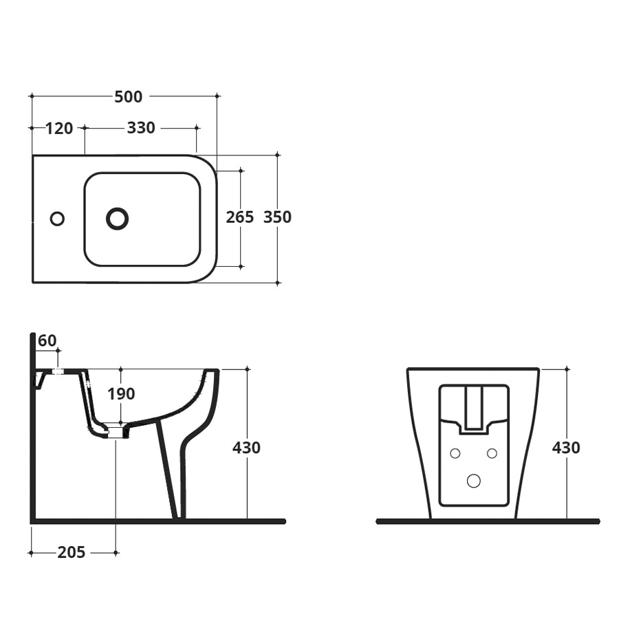 - Bidet: single-hole flush-to-wall with overflow
