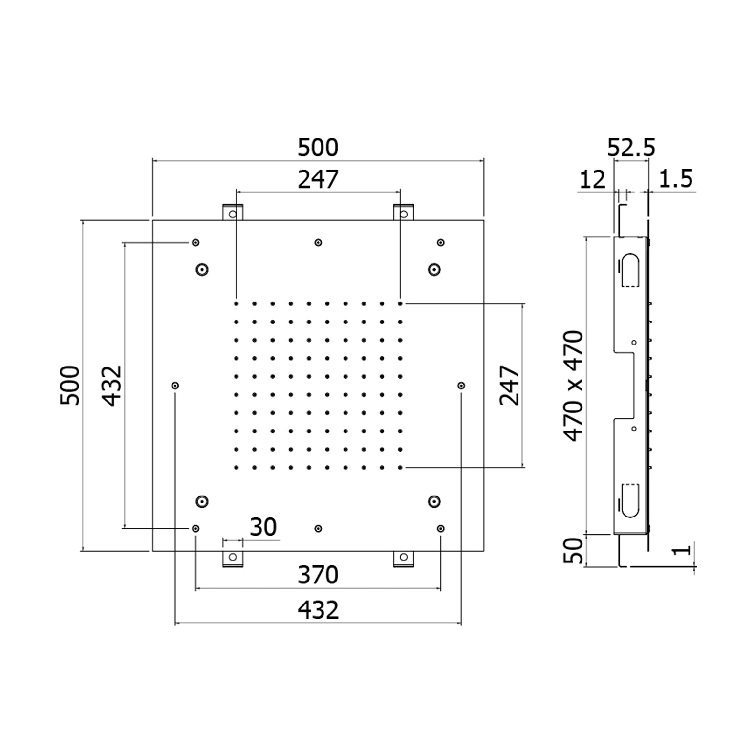 - Dimensiones: difusor cuadrado de 500 x 500 mm en metal