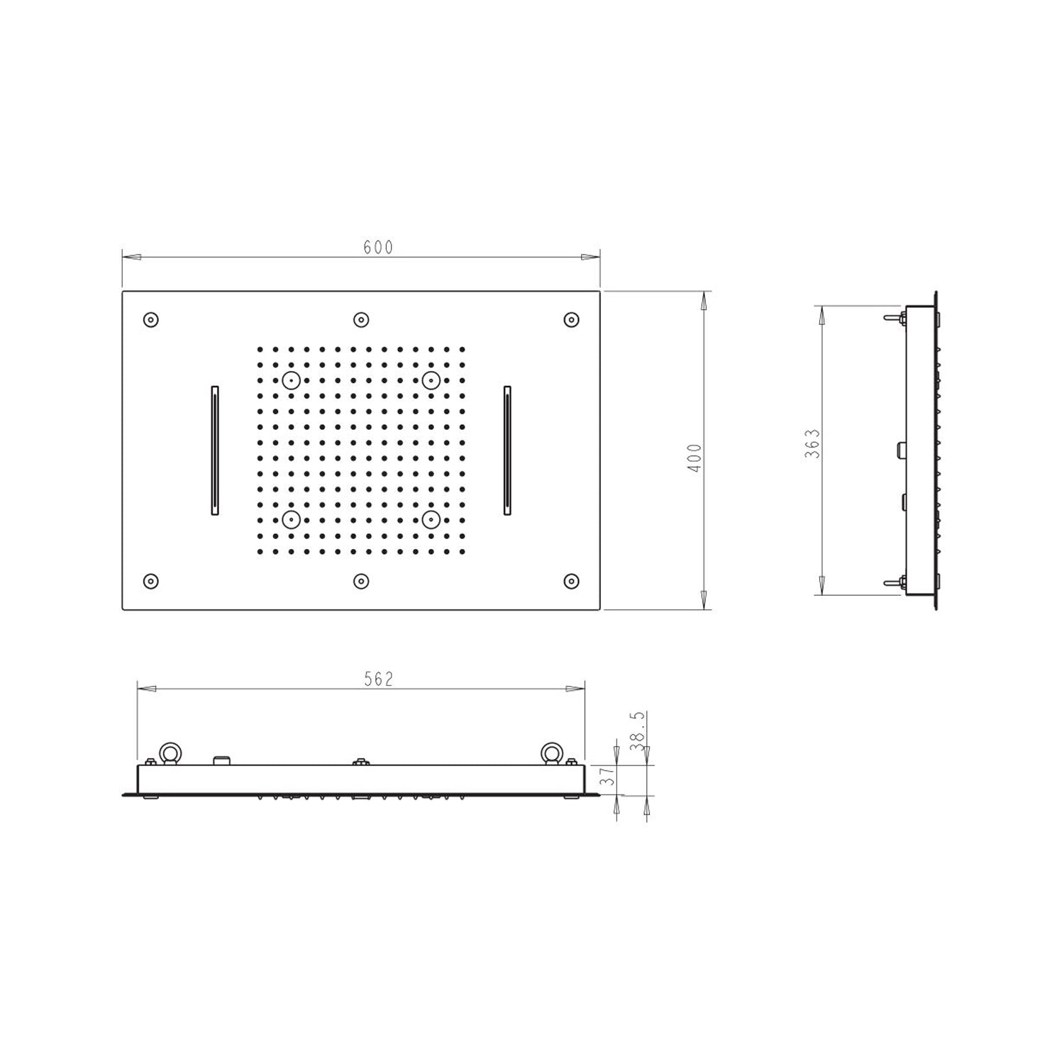 Soffione Sky 60x40cm en acero con anticalcáreo y 3 chorros