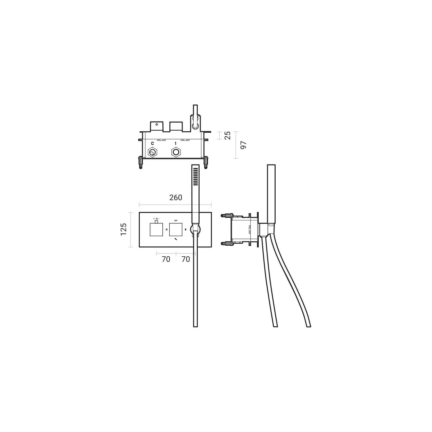 El mezclador termostático empotrado con set de ducha mod. "Q" en latón con desviador 3-2 vías es una celebración de la elegancia sobria y la practicidad diaria. Fabricado en latón de alta calidad, presenta un acabado brillante que refleja la luz del baño con discreción. La atención al detalle y la precisión en el trabajo aseguran un rendimiento fiable a lo largo del tiempo, con control constante de la temperatura y protección contra quemaduras que combina seguridad y confort.