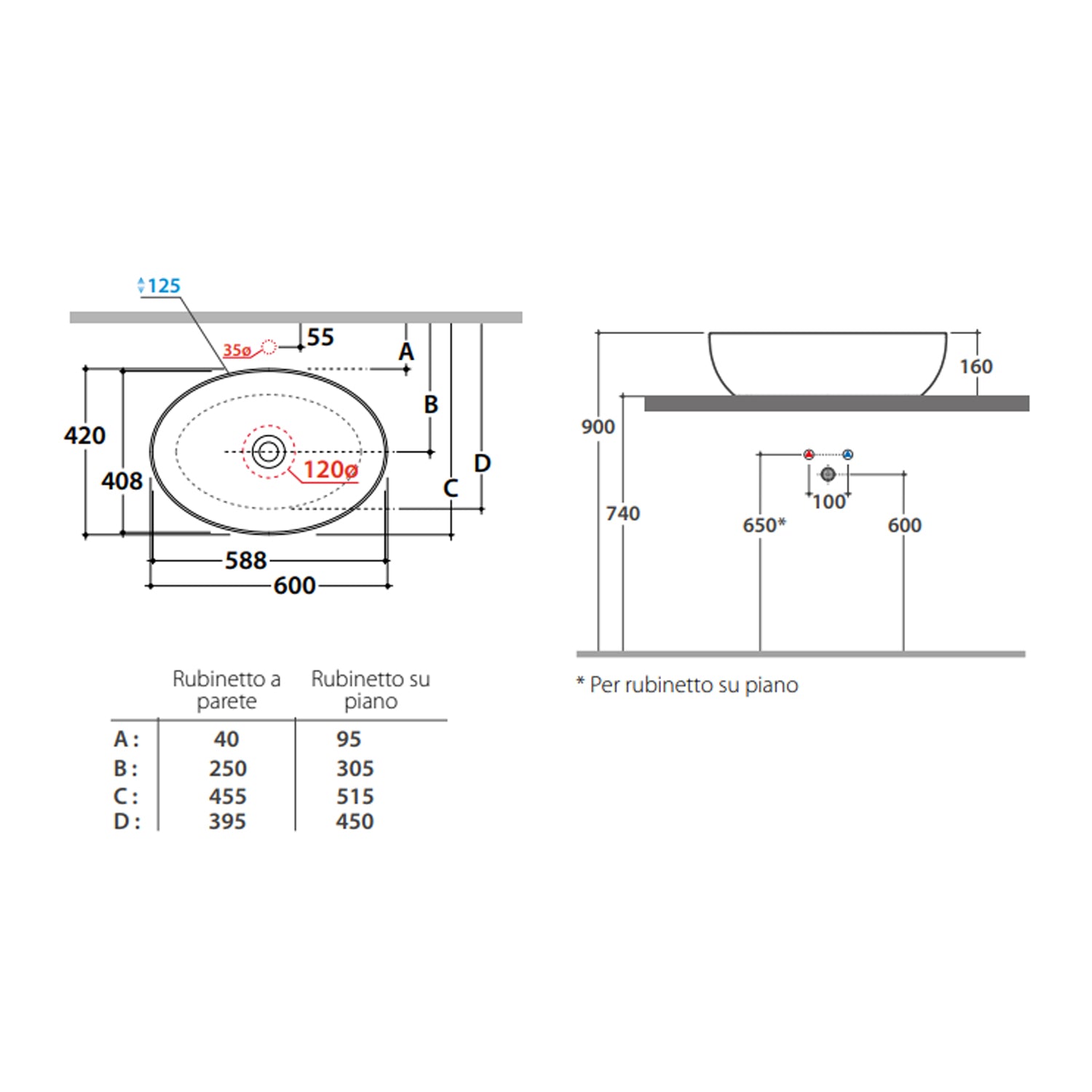- Dimensiones externas: 60 x 42 x 16 cm, lavabo de apoyo ovalado