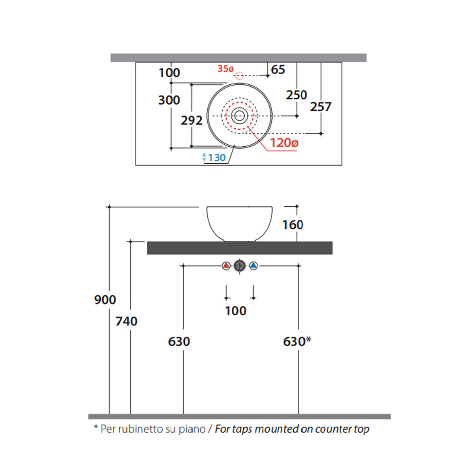 Lavabo redondo diámetro 30 cm altura 16 cm. Instalación de apoyo. En cerámica blanca