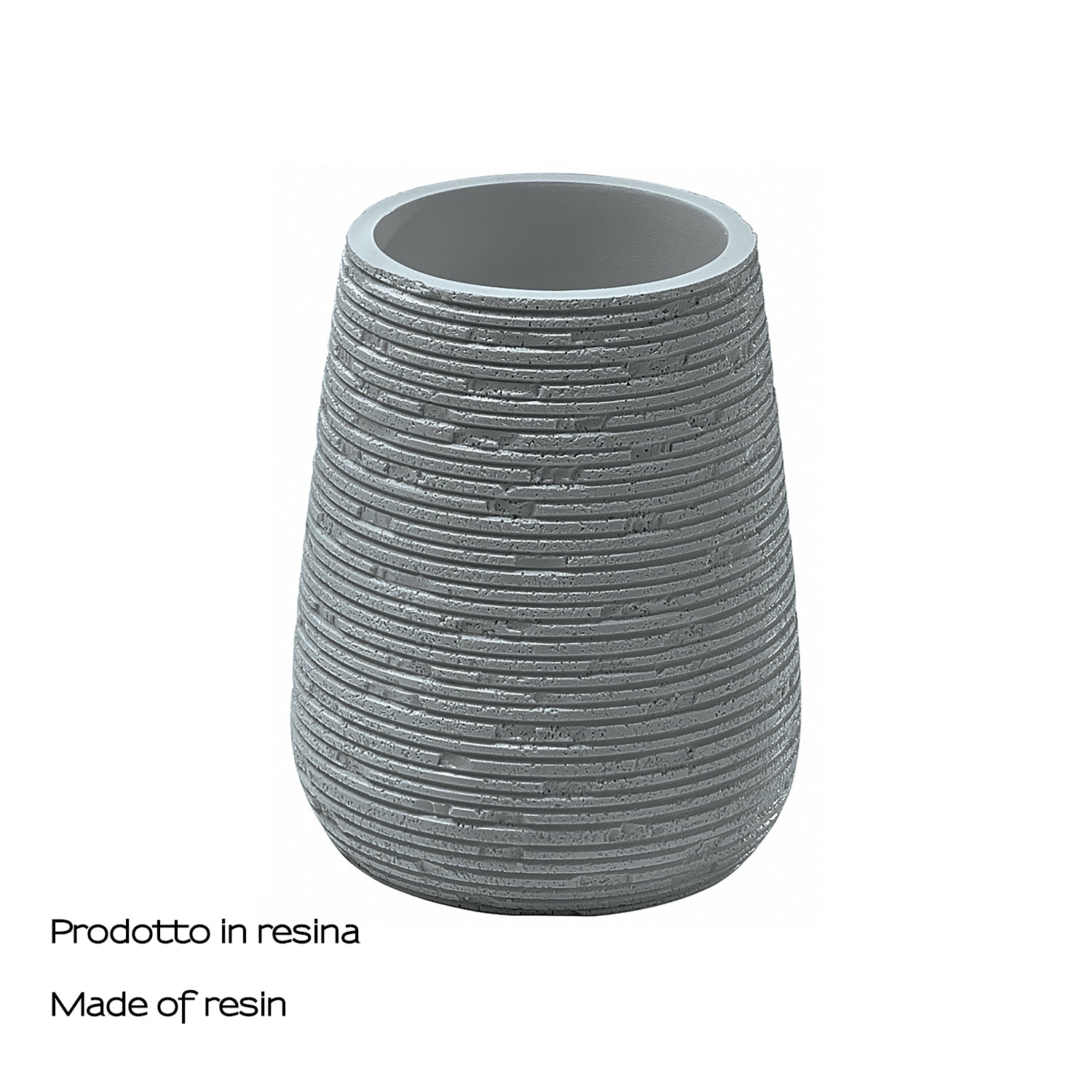Portavasos para cepillos de dientes de apoyo de la serie Gemini de Gedy, realizado en resina de alta calidad y acabado en gris piedra. El cuerpo, modelado con una textura de anillos que recuerda a la piedra trabajada, ofrece una presencia sobria y refinada al baño. El diseño minimalista y el tono neutro se integran con cualquier estilo de decoración, ofreciendo una línea que realza la cotidianidad sin ostentación.