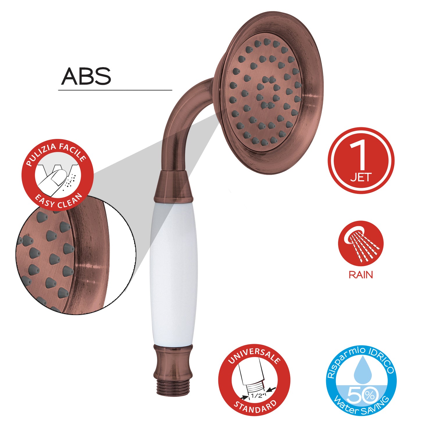 La pomme de douche Liberty monojets de Gedy, en ABS avec finition cuivre et manche blanc, exprime une élégance intemporelle. Les lignes sobres et la surface brillante témoignent d'un souci du détail apprécié dès le premier contact. Conçue pour la douche ou la baignoire, elle allie esthétique classique et fonctionnalité fiable, grâce aux buses anticalcaires qui maintiennent les performances dans le temps.